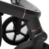 -Kolieska kočíka sú vybavené špeciálnou gumou, ktorá pohltí všetky otrasy rovnako ako nafukovacie kolieska.